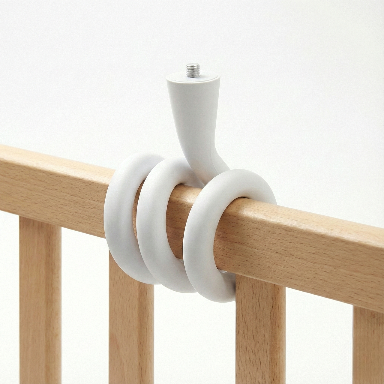 תושבת סיליקון גמישה למצלמת תינוק – נצמדת בקלות לעריסה או למיטה, בלי קידוח וללא צורך בחורים.