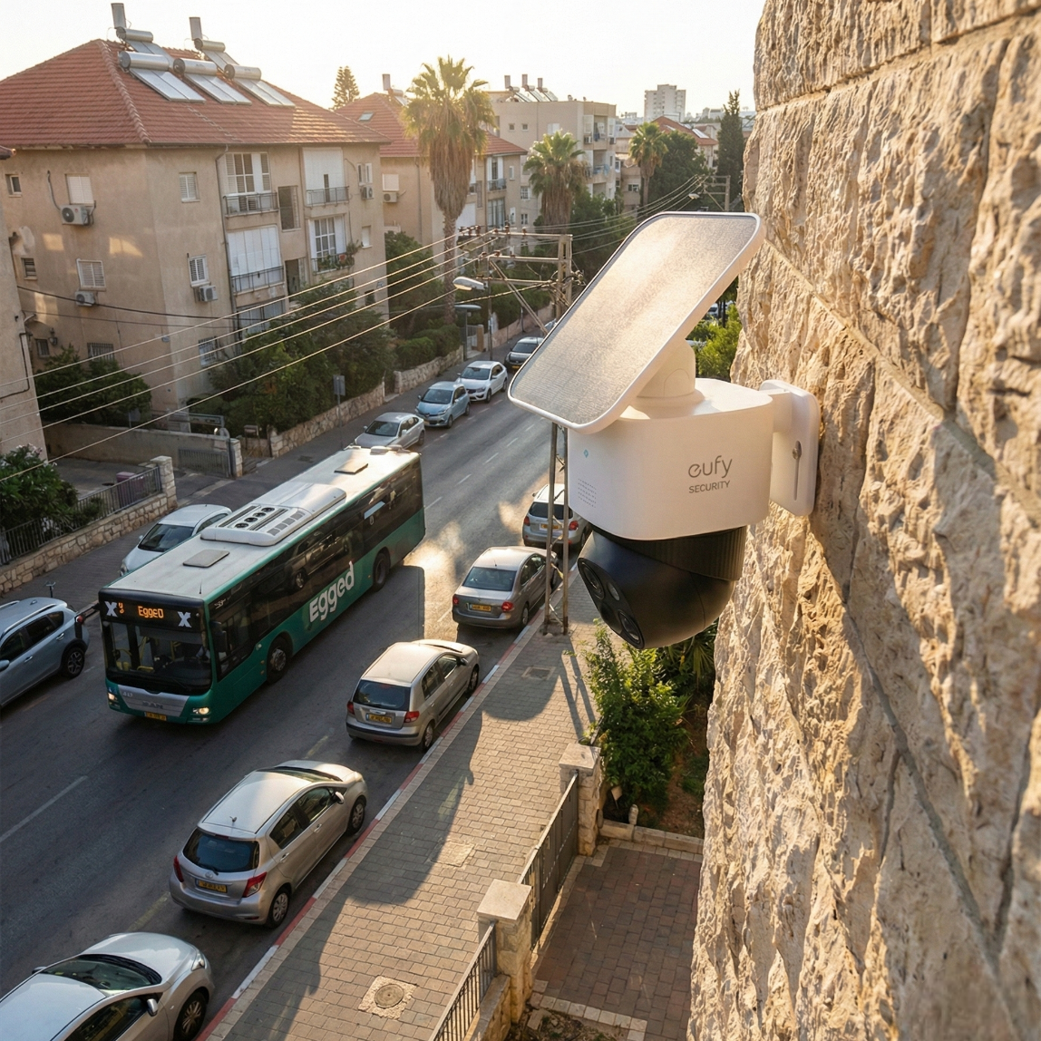 מצלמת WiFi עם פאנל סולארי, כיסוי מלא בזכות עדשה כפולה, אחסון פנימי 8GB וללא צורך בחשמל או ענן.